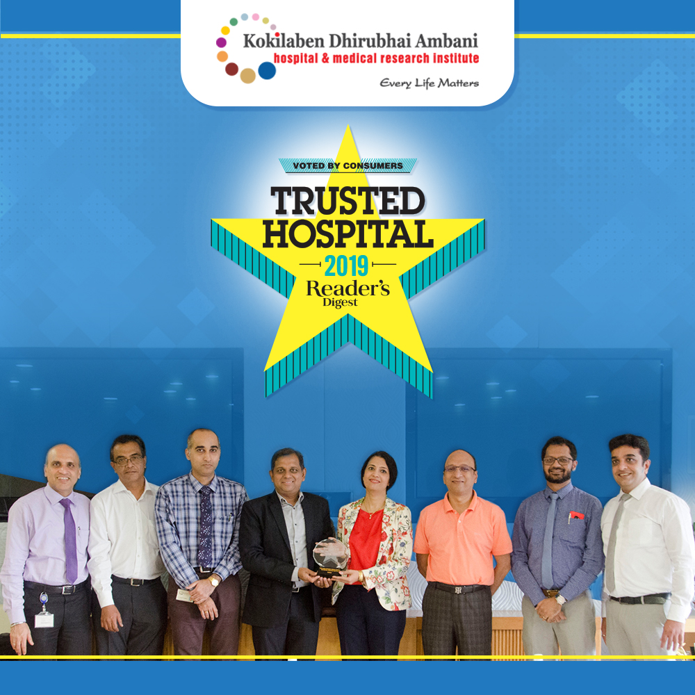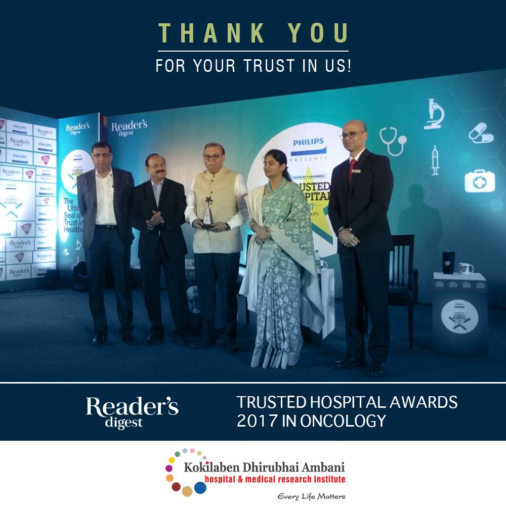 Kokilaben Dhirubhai Ambani Hospital is proud to receive the most Trusted Hospital of 2019 Award by Reader's Digest for Oncology. A big thank you to all our patients and their loved ones for placing their trust and confidence in us.