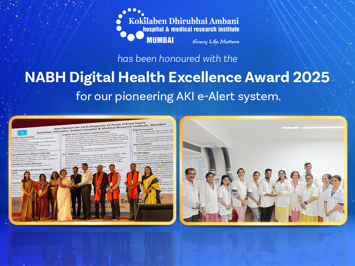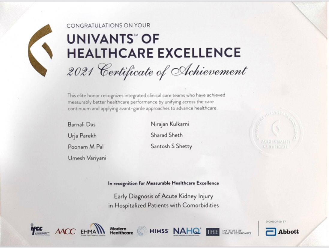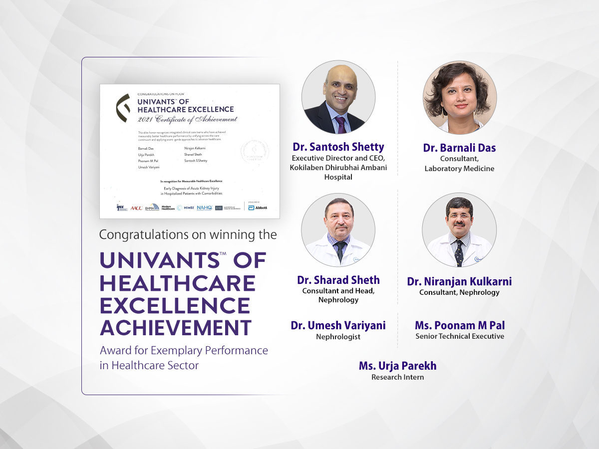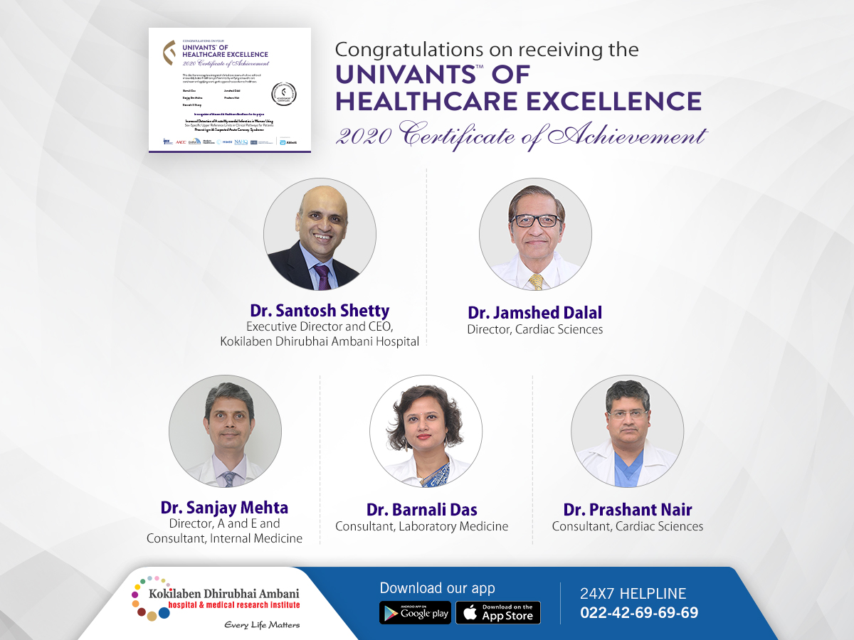Kokilaben Dhirubhai Ambani is proud to annouce that our teams have been recognised as 2020 Global Recognition of Achievement (one of the 12 teams earning this honour amongst 180 initiated applications from 141 countries) by Univants of Healthcare excellence at the Univants Global Healthcare Excellence Award Ceremony on 16th Nov. This recognition is by IFCC, AACC, EHMA, Modern Healthcare, HIMSS, NAHQ, and Institute of Health Economics & funded by Abbott. Ours is also the first healthcare institution recognised from India. The study will be published in different languages globally.