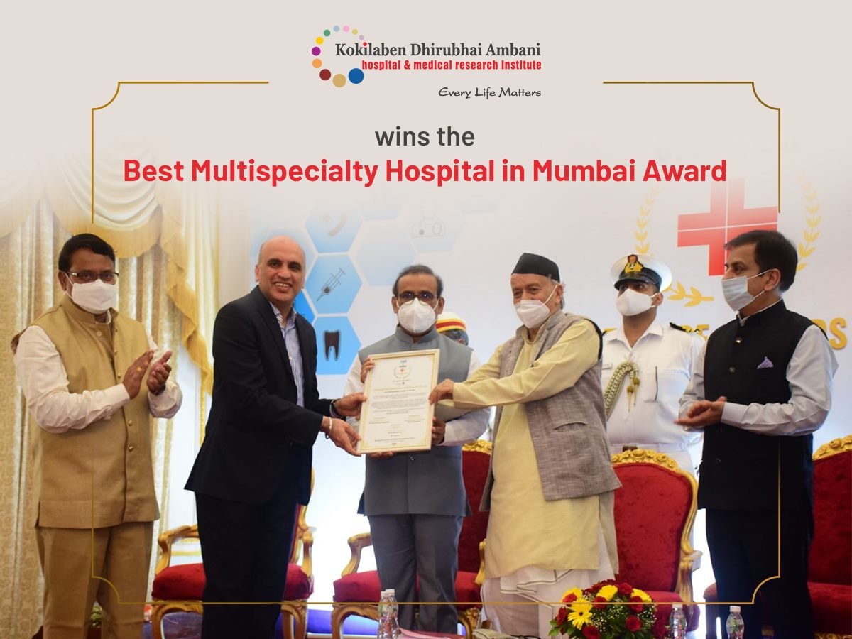 Kokilaben Dhirubhai Ambani Hospital is honoured to receive the Best Multispeciality Hospital in Mumbai award at the NavaBharat Healthcare Awards 2021 held on 31st July 2021 at Governor House. Dr. Santosh Shetty, Executive Director, and CEO, Kokilaben Dhirubhai Ambani Hospital received this prestigious award from Shri. Bhagat Singh Koshyari, Hon'ble Governor of Maharashtra in August presence of Shri. Rajesh Tope, Cabinet Minister for Public Health, Govt of Maharashtra and Shri. Nimish Maheshwari, MD, NavaBharat Group.