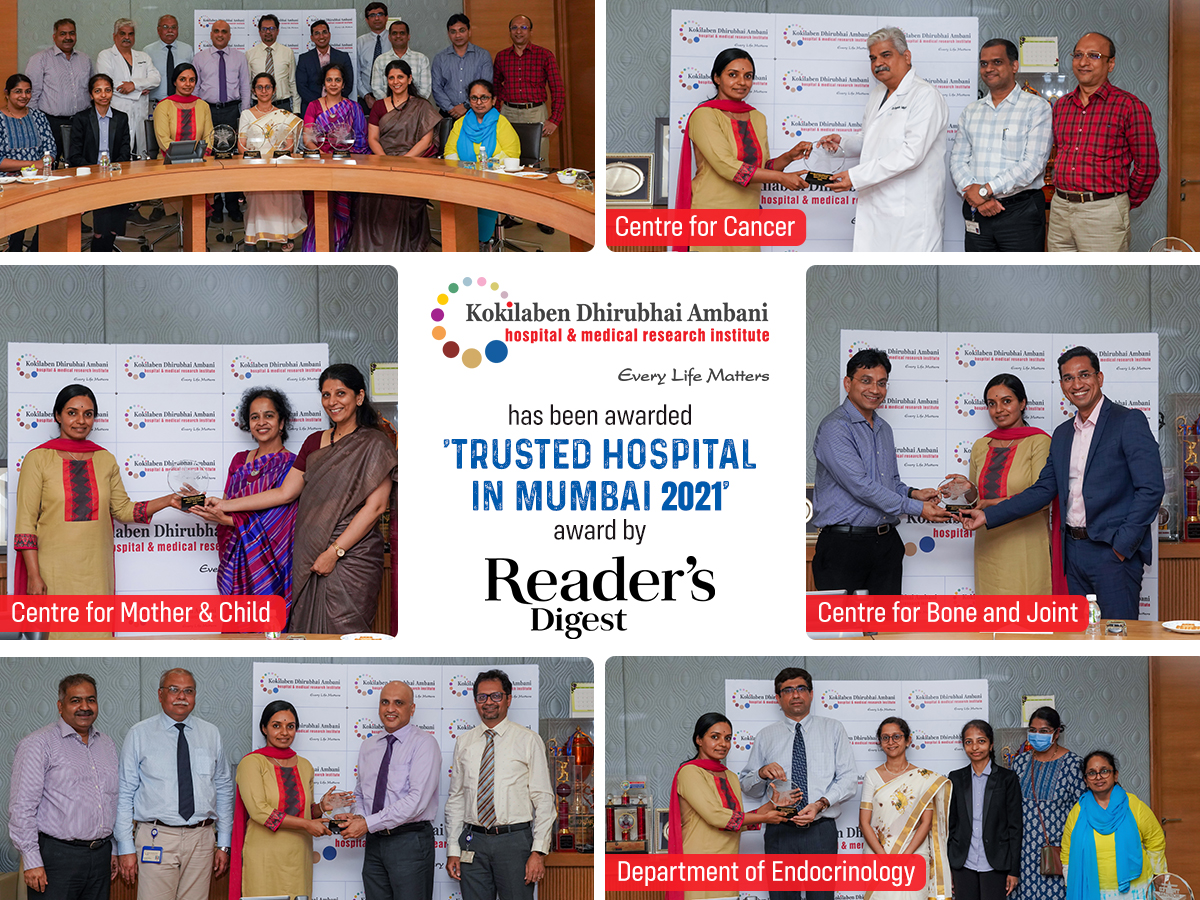 Kokilaben Dhirubhai Ambani Hospital is truly honoured to receive the Trusted Hospital in Mumbai 2021 award from Reader's Digest India for the hospital and also for the Department of Diabetes Care, IVF and Child Birth, Oncology, and Orthopaedic. We thank our patients for their trust in us and our entire team of doctors, nurses, and support staff for their dedication to making Kokilaben Dhirubhai Ambani Hospital a world-class institution.