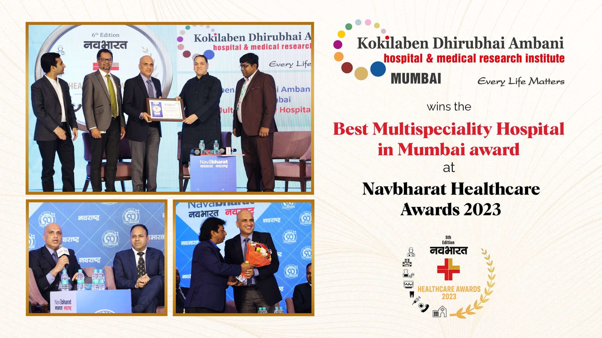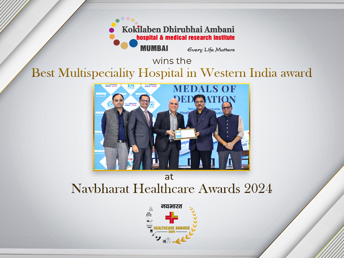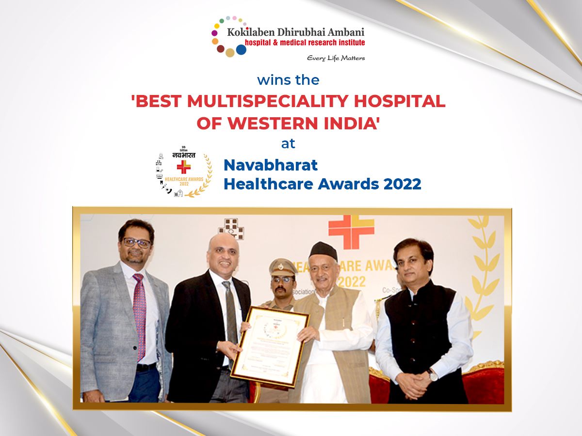 We are glad to announce that Kokilaben Dhirubhai Ambani Hospital, Mumbai has been honored with the prestigious 'Best Multispeciality Hospital in Mumbai' Award at the Navbharat Healthcare Awards 2023. This award is a testament to the trust and confidence our patients have placed in us. We extend our heartfelt gratitude to our dedicated team of healthcare professionals, whose tireless efforts and unwavering dedication have made this recognition possible.