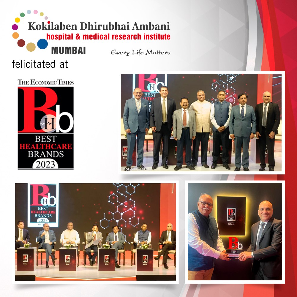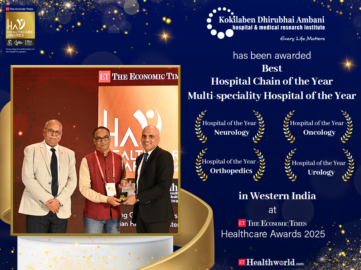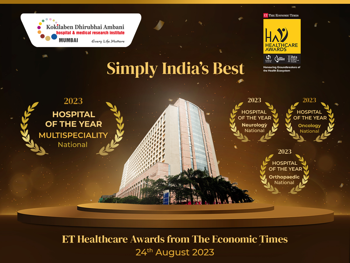Kokilaben Dhirubhai Ambani Hospital, Mumbai is truly honoured to receive the "Hospital of the Year - Multispeciality, National", "Hospital of the Year - Oncology, National", "Hospital of the Year - Neurology, National" & "Hospital of the Year - Orthopaedic, National" Awards at the prestigious ET Healthcare Awards 2023 held in New Delhi on 24th August. Our continuous efforts to excel in healthcare are indeed making a positive impact on the medical field and the lives of the people we serve. We dedicate these awards to our entire team, the doctors, the nurses, and every member of the staff and above all, the community at large for reposing its trust in us.