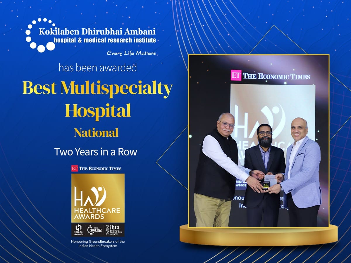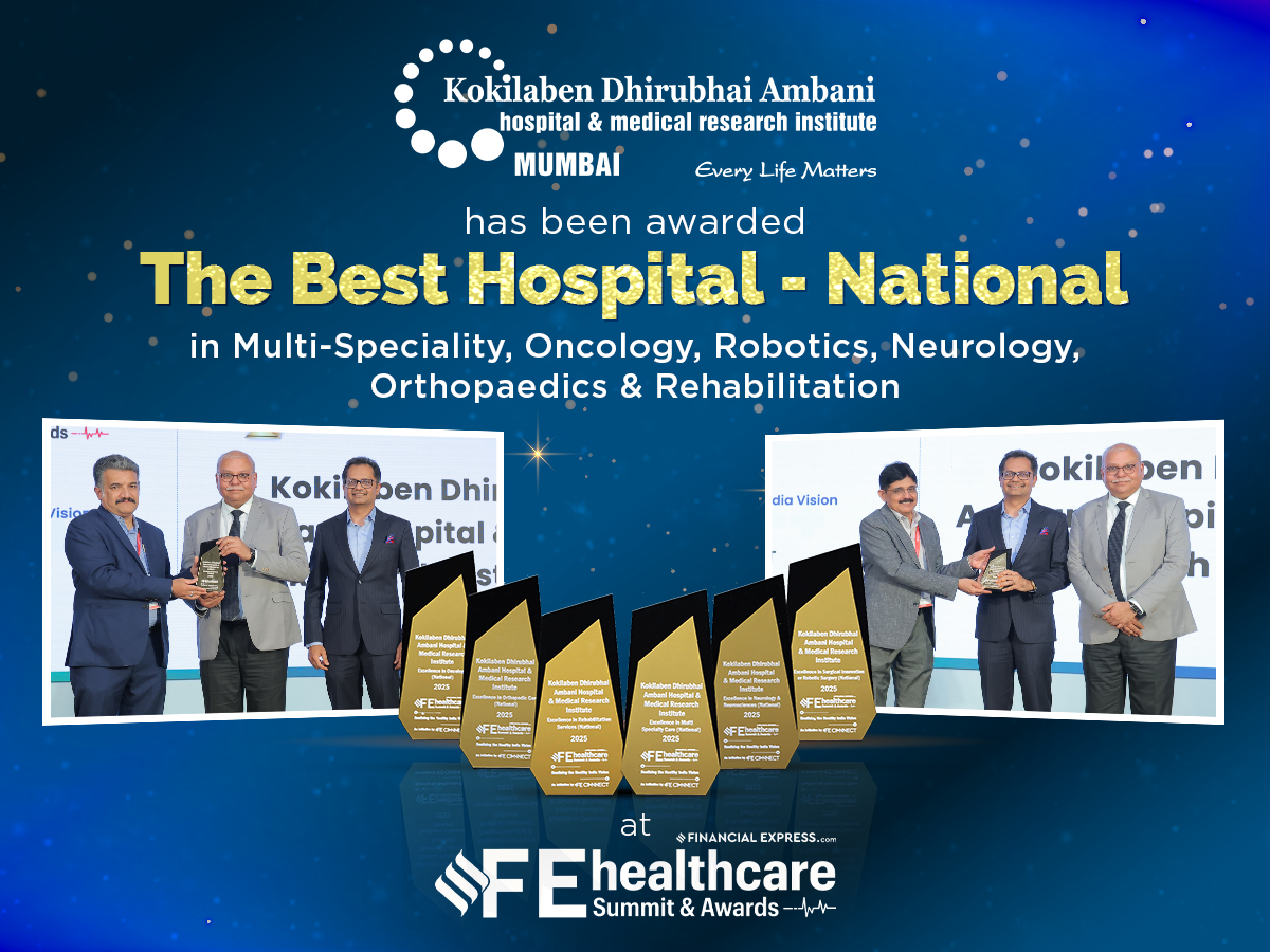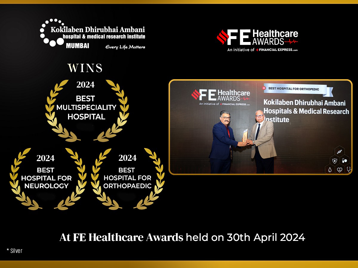 Kokilaben Dhirubhai Ambani Hospital, Mumbai is truly honoured to receive the "Hospital of the Year - Multispeciality, National", "Hospital of the Year - Oncology, National", "Hospital of the Year - Neurology, National" & "Hospital of the Year - Orthopaedic, National" Awards at the prestigious ET Healthcare Awards 2023 held in New Delhi on 24th August. Our continuous efforts to excel in healthcare are indeed making a positive impact on the medical field and the lives of the people we serve. We dedicate these awards to our entire team, the doctors, the nurses, and every member of the staff and above all, the community at large for reposing its trust in us.