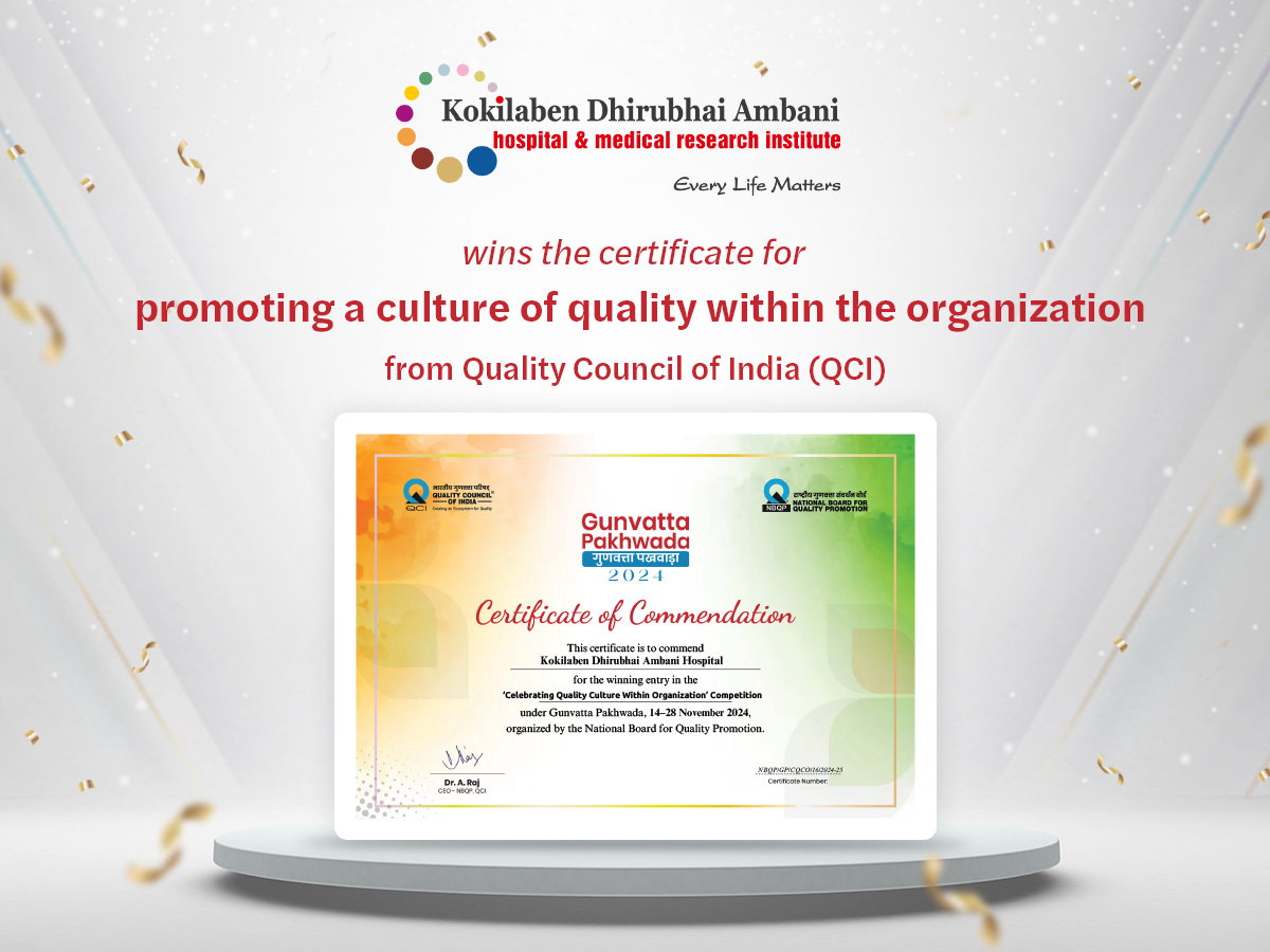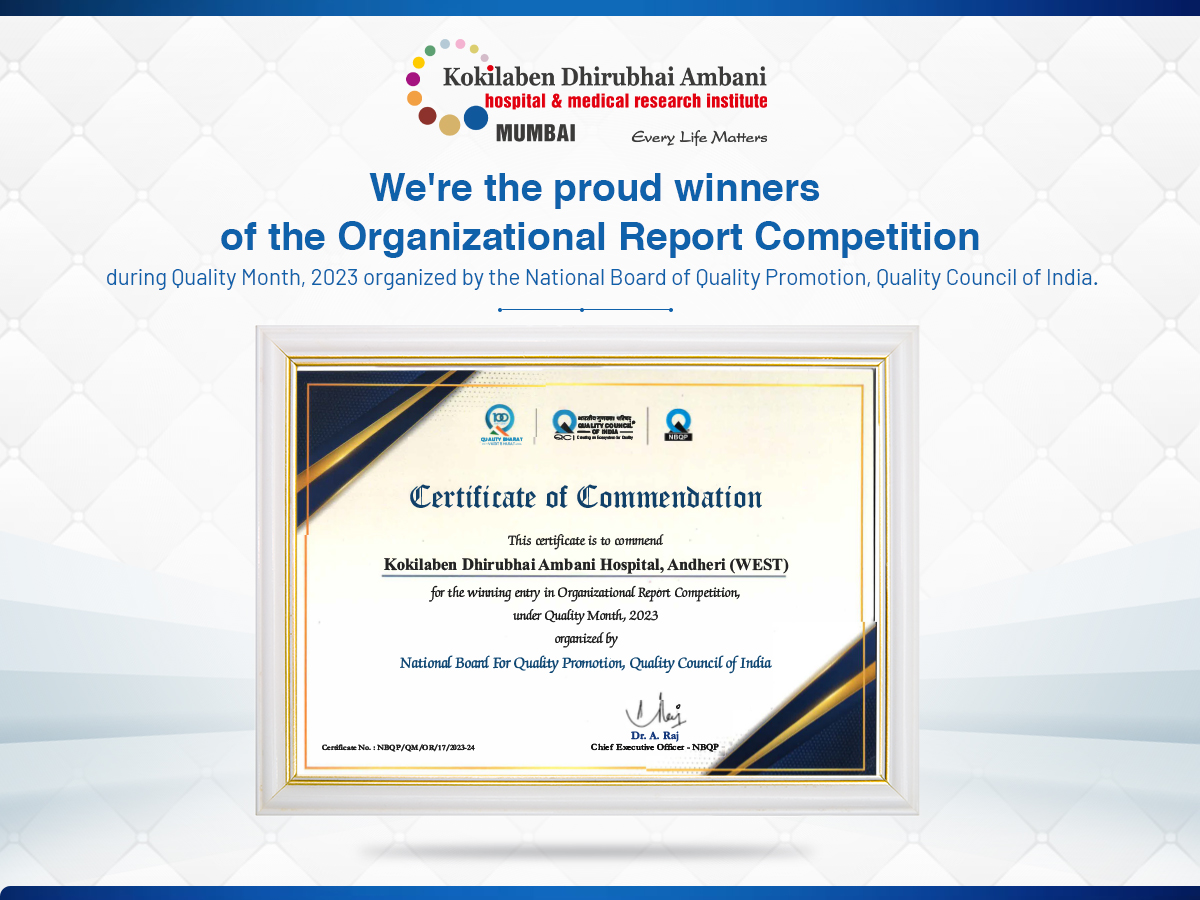 Kokilaben Dhirubhai Ambani Hospital, Mumbai, is proud to be the winner of the Organizational Report Competition during Quality Month 2023! Under the theme "Quality Culture: Everyone’s Responsibility," we dedicated the entire month of November 2023 to celebrating and promoting a culture of quality across our organization. A heartfelt thank you to the Quality Council of India (QCI) and NBQP-National Board for Quality Promotion for recognizing and acknowledging our efforts. At Kokilaben Dhirubhai Ambani Hospital, Mumbai, we value teamwork and prioritize quality in all aspects of our work. This win reflects the dedication of our entire team.