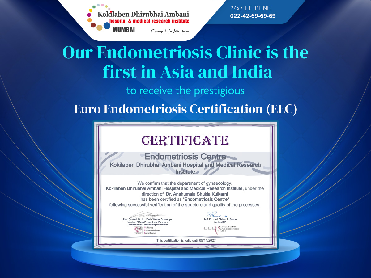 Kokilaben Dhirubhai Ambani Hospital, Mumbai is honoured to announce a landmark achievement in women’s healthcare in India, with our Endometriosis Centre becoming the first and only in the country and Asia, to be officially recognized and certified by the European Endometriosis League (EEL) under the EuroEndoCert program. This prestigious certification underscores our unwavering dedication to providing world-class, evidence-based care for women suffering from endometriosis—a complex and often debilitating condition that affects millions worldwide but remains frequently underdiagnosed and undertreated.