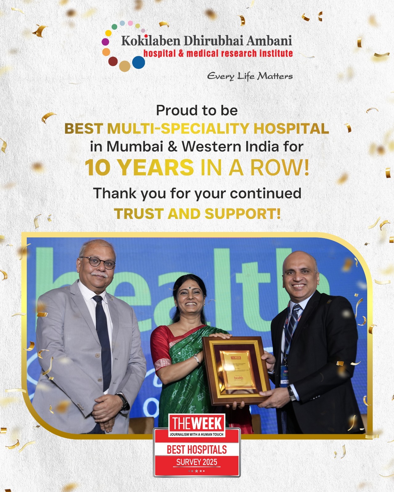 We are pleased to announce that Kokilaben Dhirubhai Ambani Hospital, Mumbai has been ranked as the No. 1 Multispeciality Hospital in Mumbai and Western India for the 9th consecutive year.