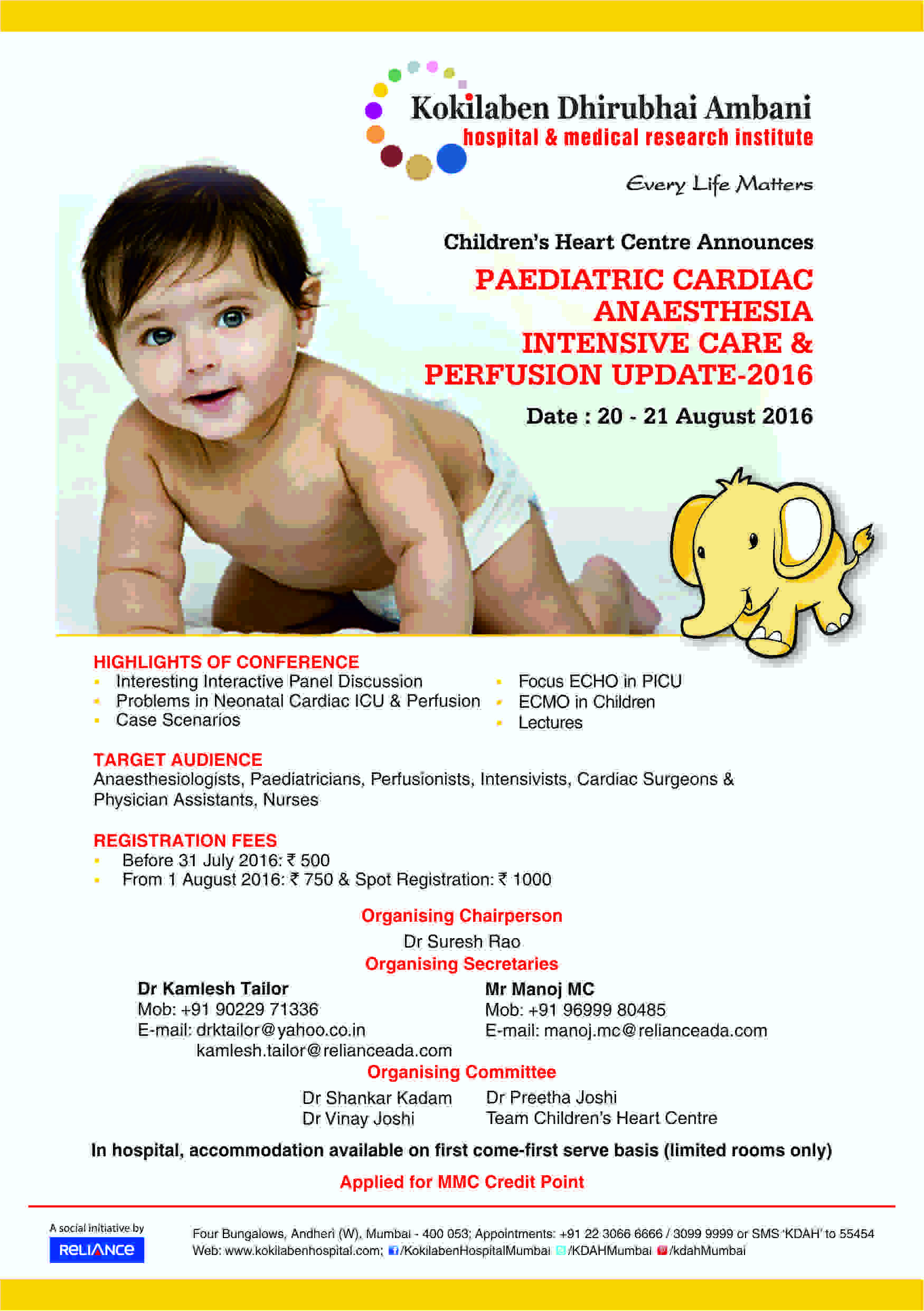 Kokilaben Dhirubhai Ambani Hospital's Children's Heart Centre announces the Paediatric Cardiac Anaesthesia Intensive Care and Perfusion Update 2016 between 20 - 21st August 2016 where emminent doctors will discuss problems in Neonatal Cardiac ICU & Perfusions, Focus on ECHO in PICU, ECMO in children, case scenarios and lectures.