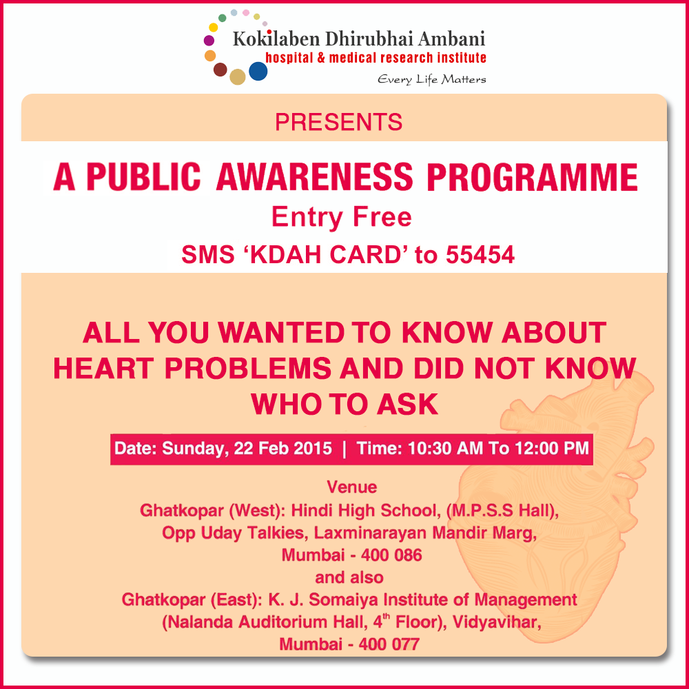 Kokilaben Dhirubhai Ambani Hospital invites you and your family for a public awareness program for heart related problems. Educate yourself with our team of expert cardiologists, physicians and experts on the warning signs and risk factors for heart disease during this interactive session! Entry is FREE; SMS ‘KDAH CARD’ to 55454 to register!