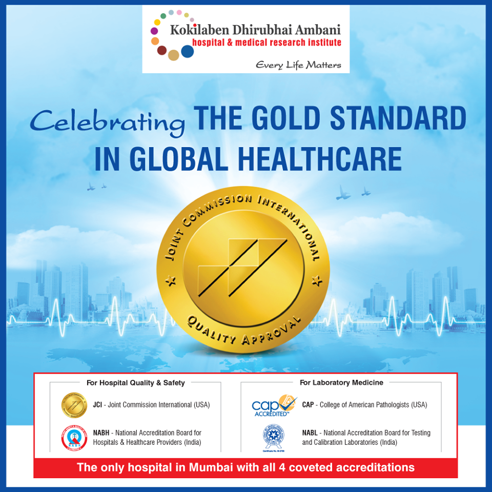 Kokilaben Dhirubhai Ambani Hospital is proud to announce its latest certification from the Joint Commission International (USA) which is considered the gold standard in global healthcare, making it the only hospital in Mumbai to have JCI, CAP (USA), NABL and NABH (India) accreditations.