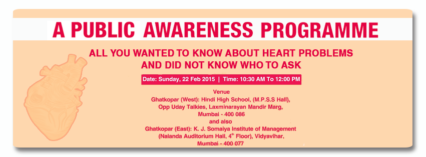 Kokilaben Hospital invites you and your family for a public awareness program for heart related problems. At 2 locations: Ghatkopar East and Ghatkopar West, on Sunday, 22nd February this is your chance to educate yourself with our team of expert cardiologists, physicians and experts on the warning signs and risk factors for heart disease during this interactive session!