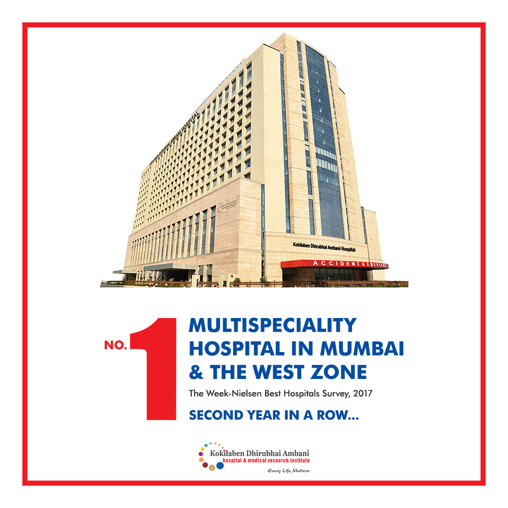 Based on the Week-Nielsen Best Hospitals Survey, 2017 Kokilaben Dhirubhai Ambani Hospital is ranked No 1 Multispeciality hospital in Mumbai and the West zone – 2 year in a row. This award is a testament to our commitment to excellence.