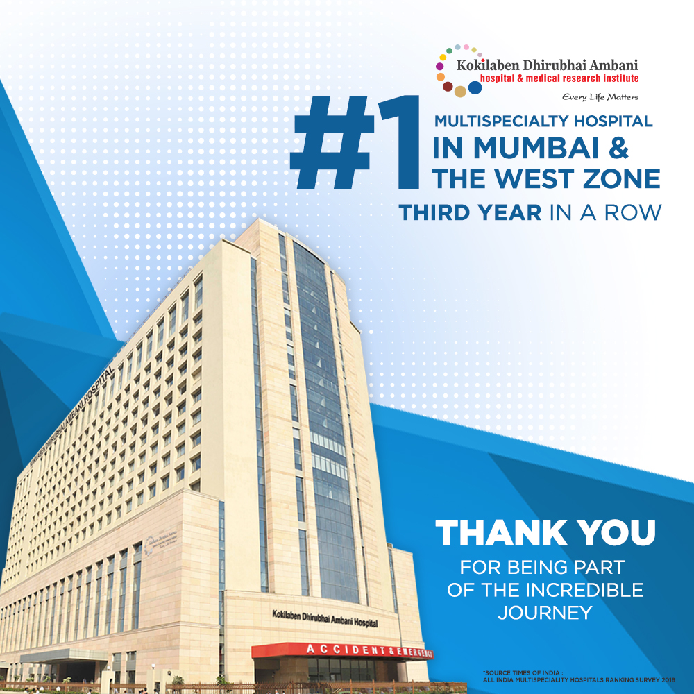 Kokilaben Dhirubhai Ambani Hospital is proud to announce that we have been ranked the No. 1 Multispecialty Hospital in Mumbai and the Western Region for the 3rd time in a row on the list of All-India Best Multispecialty Hospitals by The Times of India