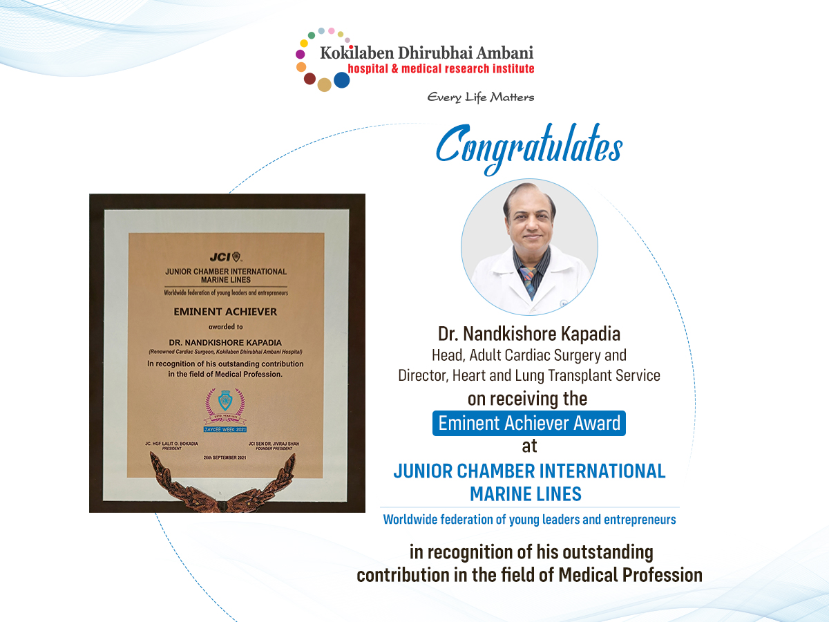 Kokilaben Dhirubhai Ambani Hospital is happy to announce that Dr. Nandkishore Kapadia, Head, Adult Cardiac Surgery and Director, Heart and Lung Transplant Service has received the prestigious "Eminent Achiever Award" at Junior Chamber International, Marine Lines for his outstanding contribution to the field of medicine. We would also like to congratulate him on being appointed the Secretary of Regional cum State Organ and Tissue Transplant Organisation (ROTTO-SOTTO), Western Region, Maharashtra Gujarat and Madhya Pradesh by the Govt of India Ministry of Health and Chairman of Regional cum State Organ and Tissue Transplant Organisation (ROTTO-SOTTO) Heart Transplant Supra urgent Committee.