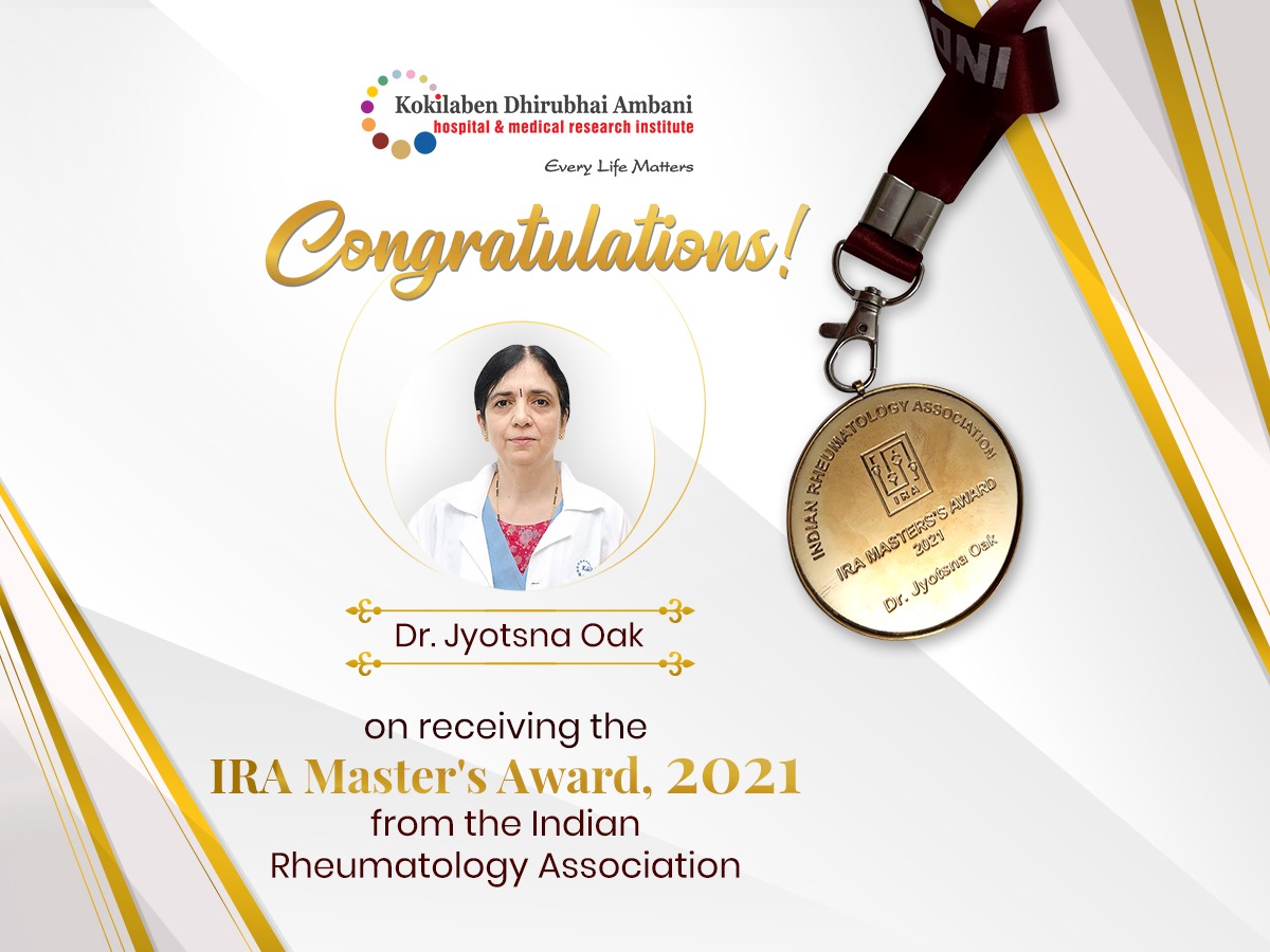 Congratulations to Dr. Jyotsna Oak, Consultant - Internal Medicine & Rheumatology, Kokilaben Dhirubhai Ambani Hospital on receiving the IRA Master's Award, 2021 from the Indian Rheumatology Association.