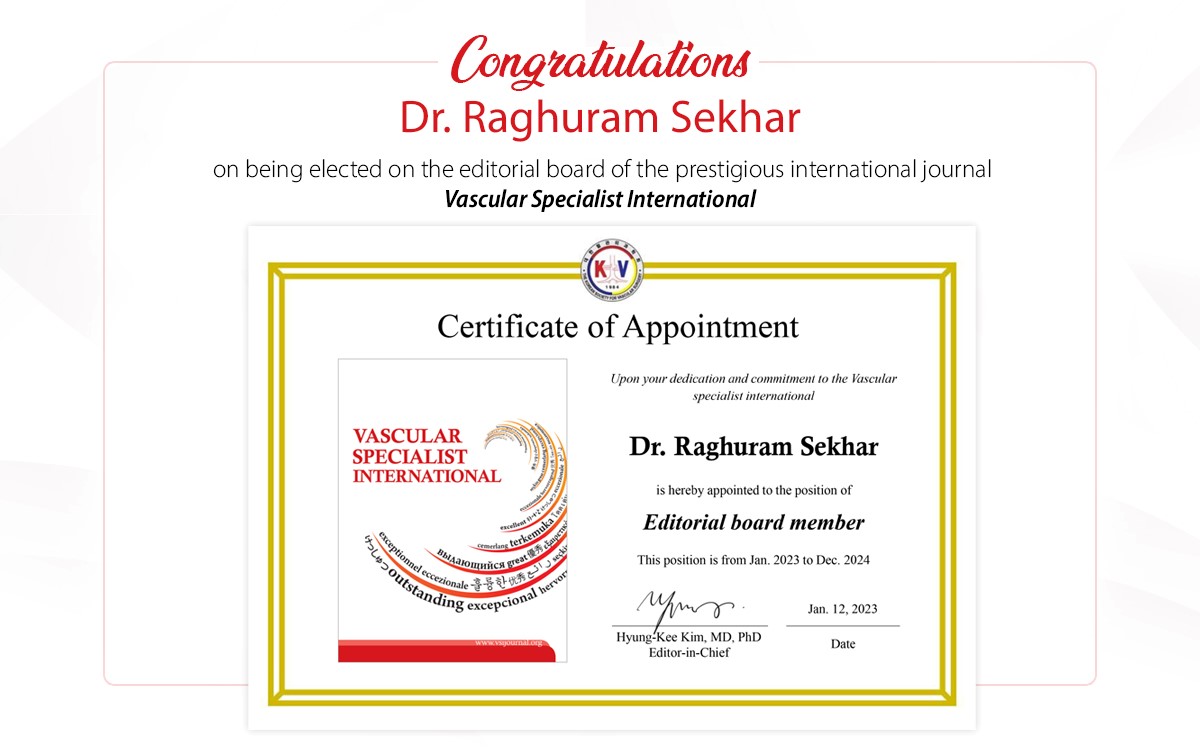 Congratulations Dr. Raghuram Sekhar, Consultant, Vascular & Endovascular Surgery, Kokilaben Dhirubhai Ambani Hospital, Mumbai on being elected on the editorial board of the prestigious international journal : Vascular Specialist International.