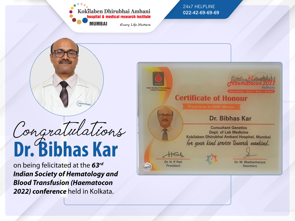 Dr Bibhas Kar received a 'Certificate of Honor' during the recently held 63rd Indian Society of Hematology and Blood Transfusion (Haematocon 2022) conference at Kolkata from 3rd to 6th November, 2022.