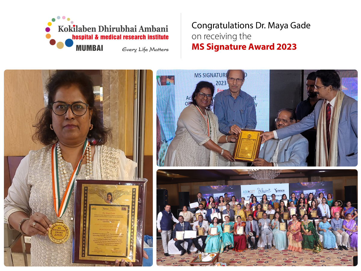Dr. Maya Gade, Consultant in Gynaecology and Obstetrics at Kokilaben Dhirubhai Ambani Hospital, Mumbai, received the prestigious MS Signature Award 2023. The award was presented by renowned dignitaries including Dr. Himanshu Bhushan, Head of Public Health Administration division of NHSRC, and Dr. Pandav, Director of AIIMS, in the presence of distinguished guests, Hon. Mr. Nitin Gadkari, Minister of Road Transport & Highways, Government of India, Mr. Devendra Fadnavis, Deputy Chief Minister of Maharashtra, Dr. Thomas F Burke, Dr. Ferdousi Begam, Dr. Saroja Pande, and various district administrators. The award recognizes Dr. Gade's outstanding contributions to the field of gynaecology.