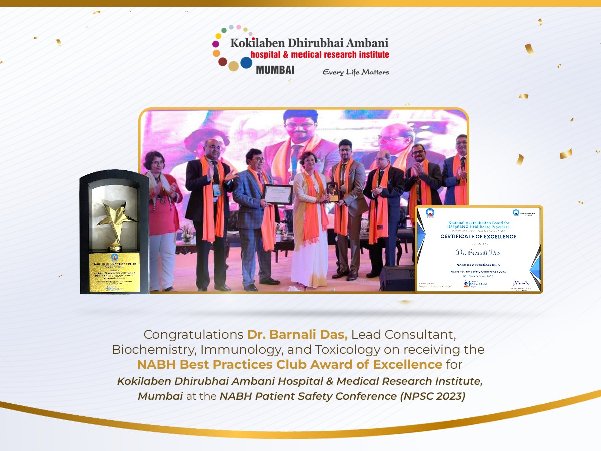 Congratulations to Dr. Barnali Das for your outstanding achievement in receiving the NABH Best Practices Club Award of Excellence for Kokilaben Dhirubhai Ambani Hospital, Mumbai at the NABH- National Accreditation Board for Hospitals and Healthcare Providers Patient Safety Conference (NPSC 2023). This recognition is a testament to your dedication and contributions to the fields of biochemistry, immunology, and toxicology.