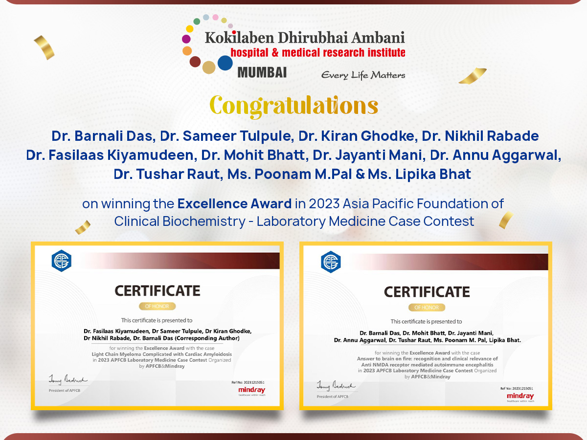 Congratulations Dr. Barnali Das, Lead Consultant, Biochemistry, Immunology, and Toxicology; Dr. Fasilaas Kiyamudeen, Overseas Trainee at Biochemistry Department; Dr. Sameer Tulpule, Consultant, General Haematology, Haemato-Oncology, and Bone Marrow Transplantation; Dr. Kiran Ghodke, Consultant Haematology & Lab Medicine; Dr. Nikhil Rabade, Consultant, Haematology and Lab Medicine and Dr. Mohit Bhatt, Director, Neurosciences and Consultant, Neurology; Dr. Jayanti Mani, Consultant, Neurology; Dr. Annu Aggarwal, Consultant, Neurology, Specialist Cognitive, and Behavioural Neurology; Dr. Tushar Raut, Consultant Neurology; Ms. Poonam M. Pal, Sr. Technical Executive & Ms. Lipika Bhat, Intern for winning the Excellence Award with the two cases ‘Light Chain Myeloma Complicated with Cardiac Amyloidosis’ and ‘Answer to the brain on fire: recognition and clinical relevance of Anti NMDA receptor-mediated autoimmune encephalitis’ in the 2023 Asia Pacific Foundation of Clinical Biochemistry (APFCB) - Laboratory Medicine Case Contest organized by APFCB & Mindray.