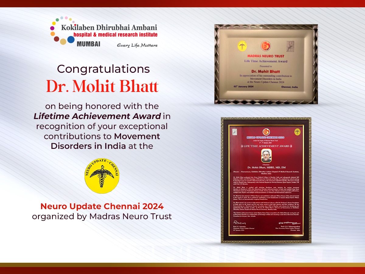 Congratulations Dr. Mohit Bhatt, Director, Neurosciences and Consultant, Neurology and Director, Medical Research, Kokilaben Dhirubhai Ambani Hospital, Mumbai on receiving the well-deserved Lifetime Achievement Award at Neuro Update Chennai 2024 organized by Madras Neuro Trust. Your exceptional contributions to Movement Disorders in India have left an indelible mark on the field. May this recognition serve as a testament to your unwavering commitment to advancing neurology in India.