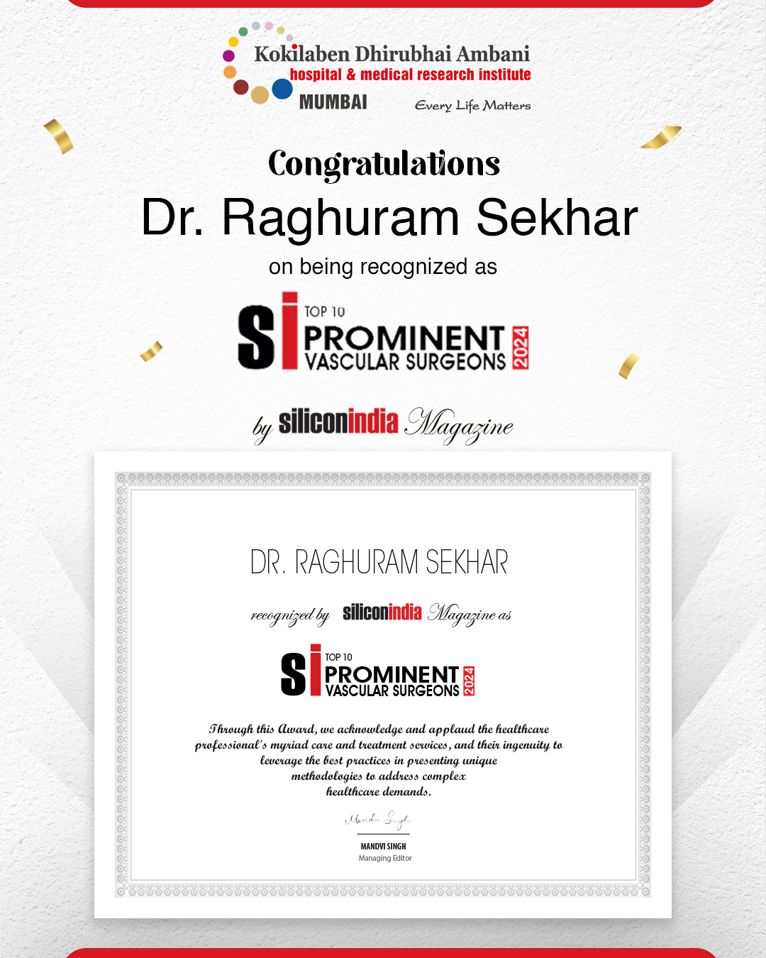 Congratulations to Dr. Raghuram Sekhar, Consultant, Vascular and Endovascular Surgery at Kokilaben Dhirubhai Ambani Hospital, Mumbai, for his outstanding achievement! Being recognized as one of the Top 10 Prominent Vascular Surgeons of 2024 by siliconindia Magazine is a testament to Dr. Sekhar's exceptional skill, dedication, and commitment to excellence. We are incredibly proud to have Dr. Sekhar as part of our team, and we applaud him for this well-deserved honor!