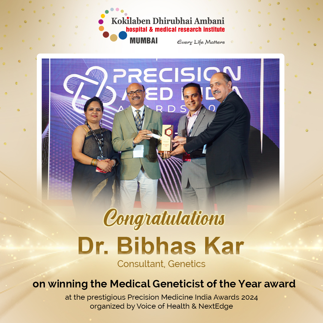 Congratulations Dr. Bibhas Kar, Consultant, Genetics at Kokilaben Dhirubhai Ambani Hospital, Mumbai on receiving the esteemed 'Medical Geneticist of the Year' award at the prestigious Precision Medicine India Awards 2024! Your dedication, expertise, and contributions to the field of medical genetics are truly commendable. We are immensely proud to have you as part of our team.