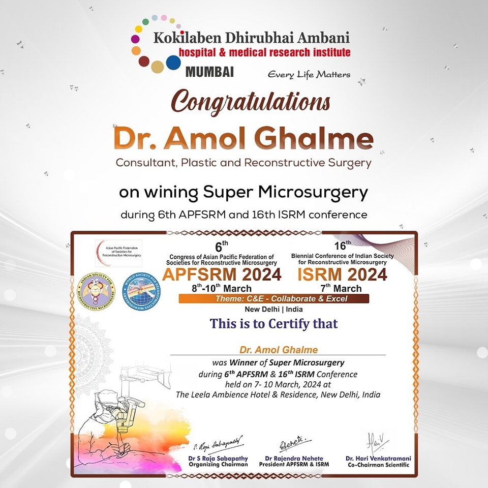 Congratulations to Dr. Amol Ghalme, Consultant, Plastic and Reconstructive Surgery, for his outstanding achievement in winning the Super Microsurgery competition during the 6th APFSRM and 16th ISRM conference 2024! His dedication and expertise shine brightly in this achievement.