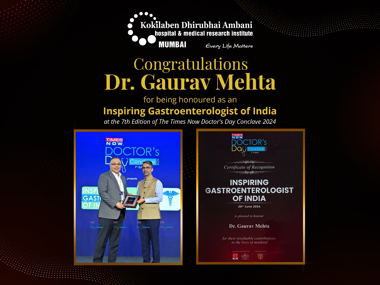 We are elated to announce that Dr. Gaurav Mehta, Consultant, Gastroenterology/Hepatology and Transplant Hepatology at Kokilaben Dhirubhai Ambani Hospital, Mumbai, has been honored as one of the top inspiring doctors in Gastroenterology at the 7th Edition of The Times Now Doctor's Day Conclave 2024. This recognition is a testament to Dr. Mehta's unwavering dedication, exceptional expertise, and compassionate care for his patients. Congratulations, Dr. Mehta, on this well-deserved accolade. We are incredibly proud to have you as part of our team, continually setting new standards in medical excellence.
