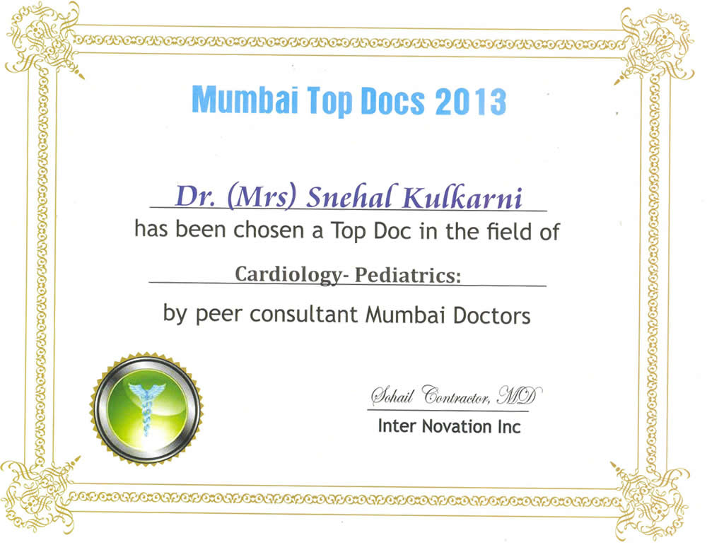 Dr. Snehal Kulkarni has been chosen as a TOP DOC in the field of Cardiology - Pediatrics by peer consultants Mumbai Doctors!