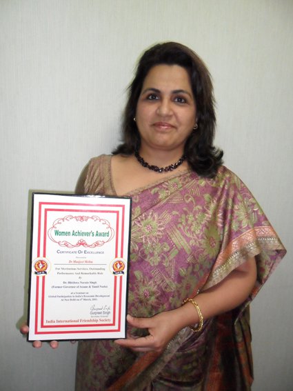 Dr Manjeet Mehta has been awarded with the prestigious "Women Achiever's Award" by India International Friendship Society (IIFS) for her outstanding work in the field of Genetics particularly in Genomic research, Epigenetics and Predictive testing in Inherited Cancers. This award is presented to some of the extraordinary men and women who have specialized in various fields like the science and technology, education, industry, fine arts, politics and social work in lieu of the yeoman's services rendered with excellence in their respective fields. The award along with Certificate of Excellence was presented to Dr Manjeet Mehta by Dr. Bhishma Narain Singh, Former Governor of Tamilnadu & Assam and Mr. Shekhar Dutt, Governor of Chattisgarh in a seminar on Global Participation in India's Economic Development held at New Delhi. Among the some renowned past recipients of this Award include Mother Teresa, former Vice-President of India, Shri B.D. Jatti, Chief Justice of Supreme Court of India, Justice P.N. Bhagwati, Maestro Ustad Amjad Ali Khan, Hockey Olympian, Dhanraj Pillay, Governors of few States, educationists, players and other renowned personalities in lieu of extraordinary services rendered by them in their respective fields.