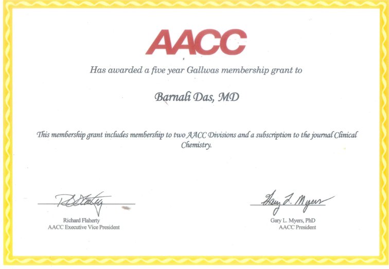 The AACC Annual Meeting is the largest clinical laboratory exposition in the world for clinical laboratory medicine attended by world renowned scientists and more than 600 organizations. Previously Dr. Barnali has also received 2 International and 3 National Awards.