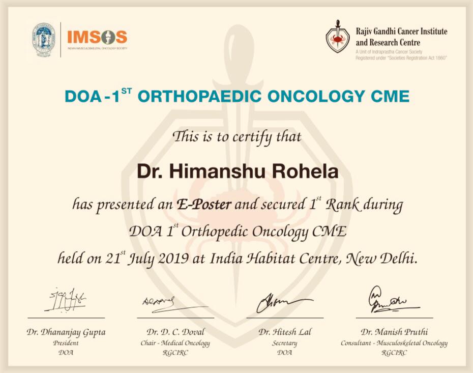 Dr. Himanshu Rohela presented an e-poster at the DOA 1st Orthopedic Oncology CME on July 21st 2019 and secured the 1st rank,