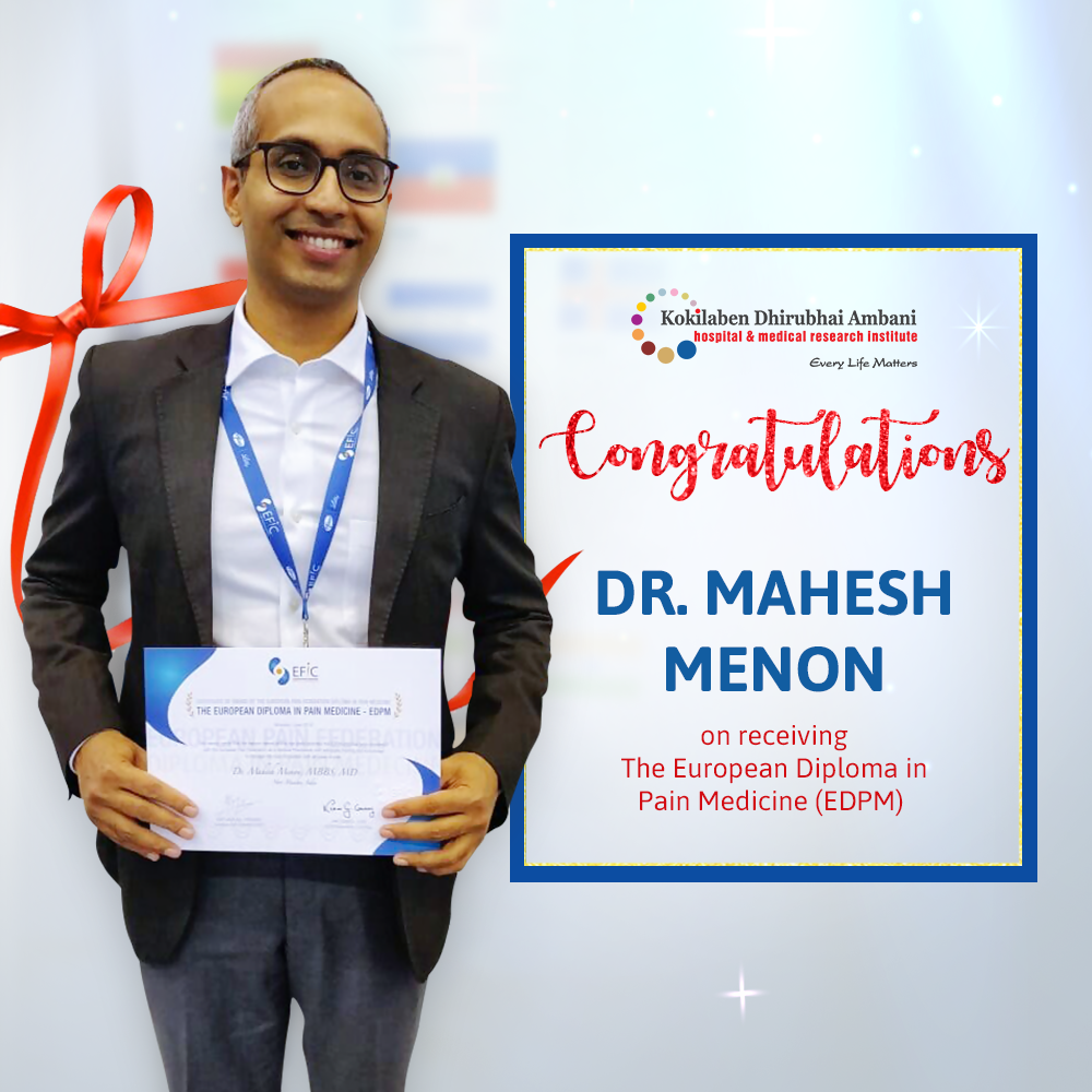 Kokilaben Dhirubhai Ambani Hospital congratulates Dr. Mahesh Menon from the Department of Pain Management and Palliative Care on being the first Indian to be awarded the European Diploma in Pain Medicine.